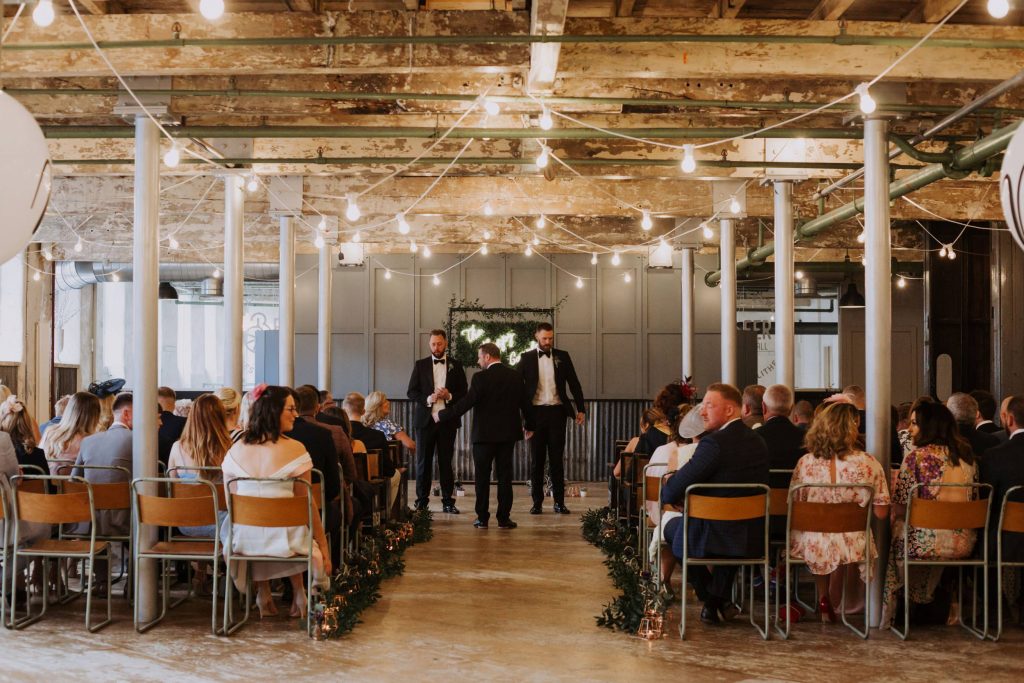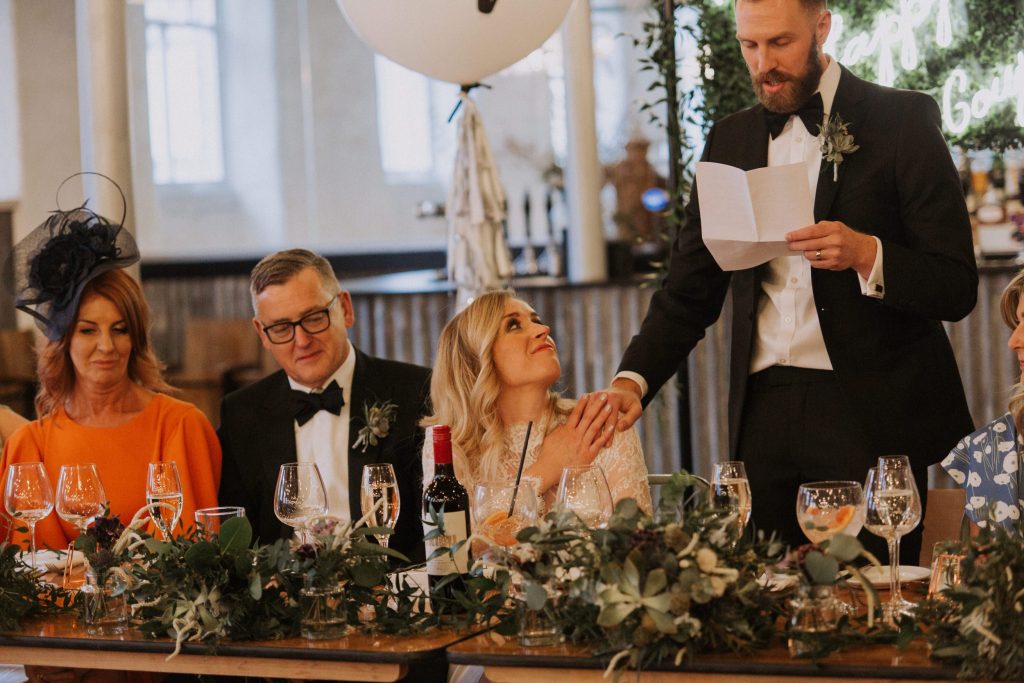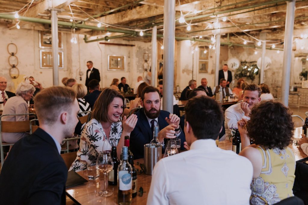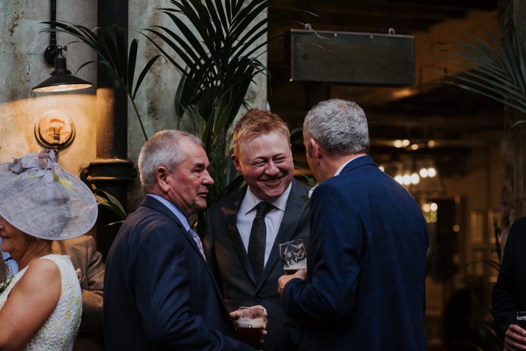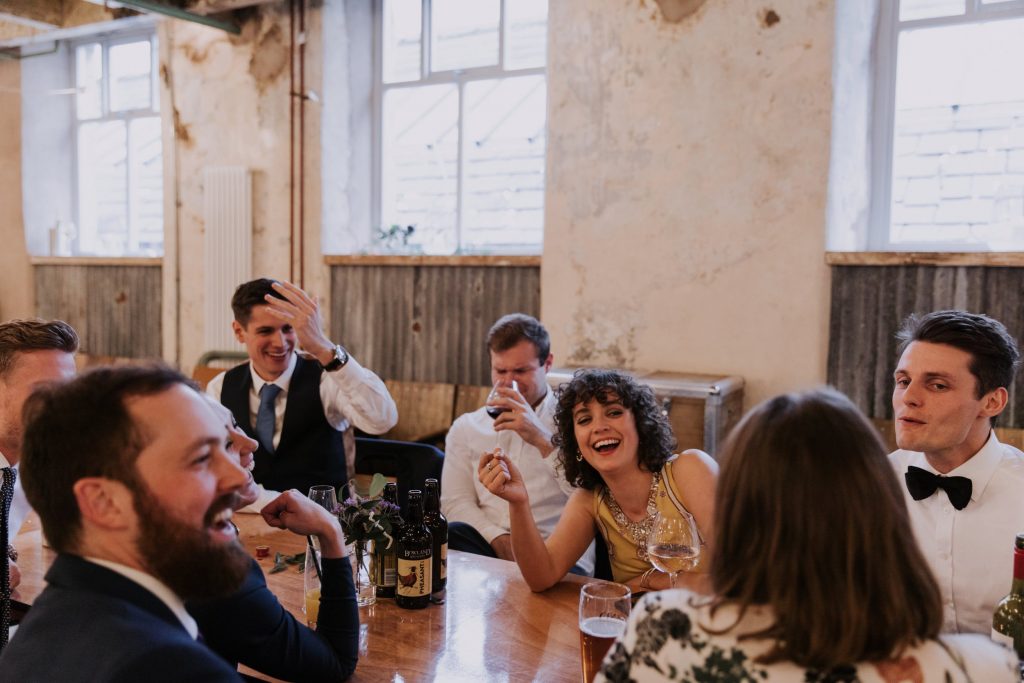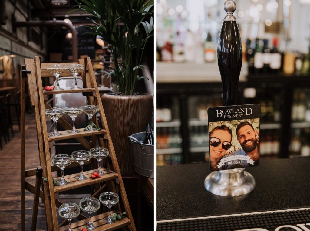 The wedding took place in the old mill upstairs, and was a huge brick room which overlooks the brewing area. Filled with festoon lights, Mr & Mrs balloons and a cool ‘The Happy Couple’ neon sign, they said their vows with everyone smiling around them 😀