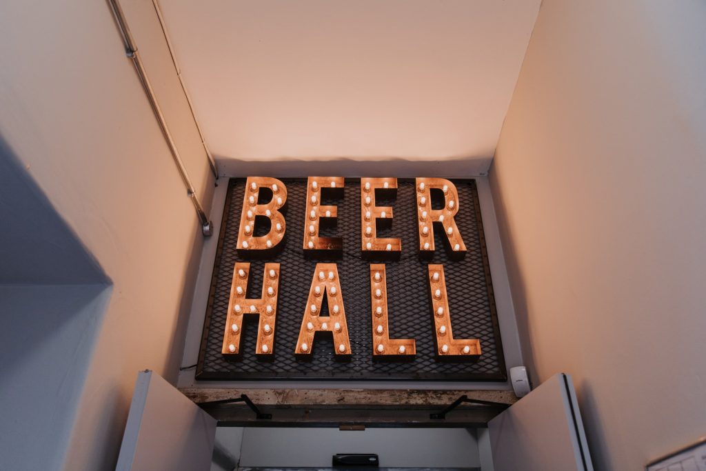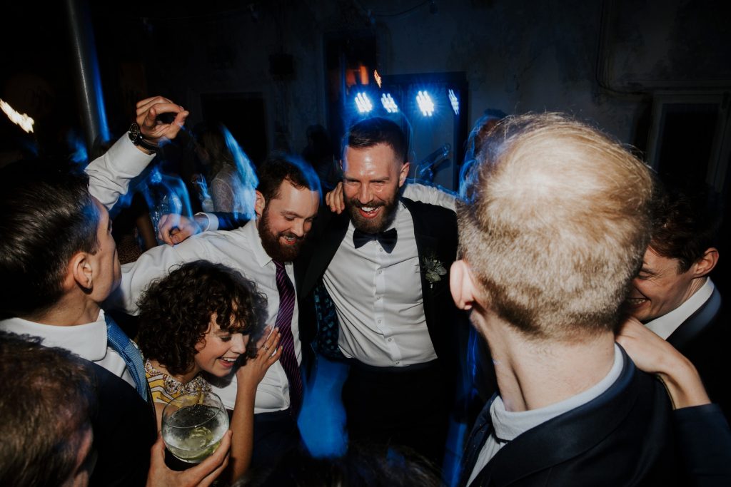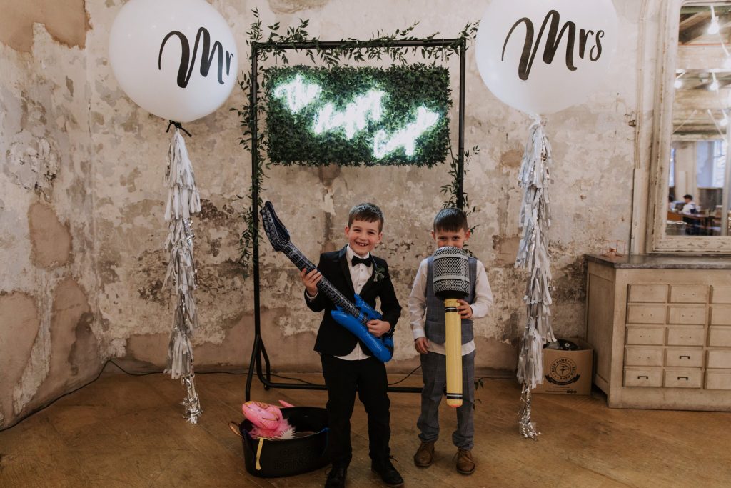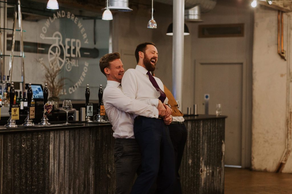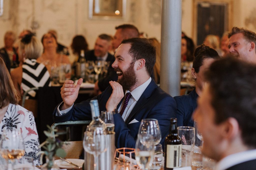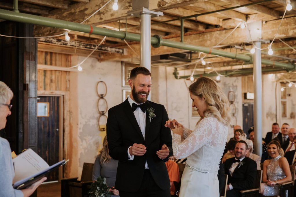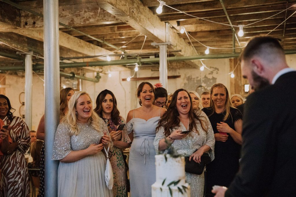 The wedding took place in the old mill upstairs, and was a huge brick room which overlooks the brewing area. Filled with festoon lights, Mr & Mrs balloons and a cool ‘The Happy Couple’ neon sign, they said their vows with everyone smiling around them 😀