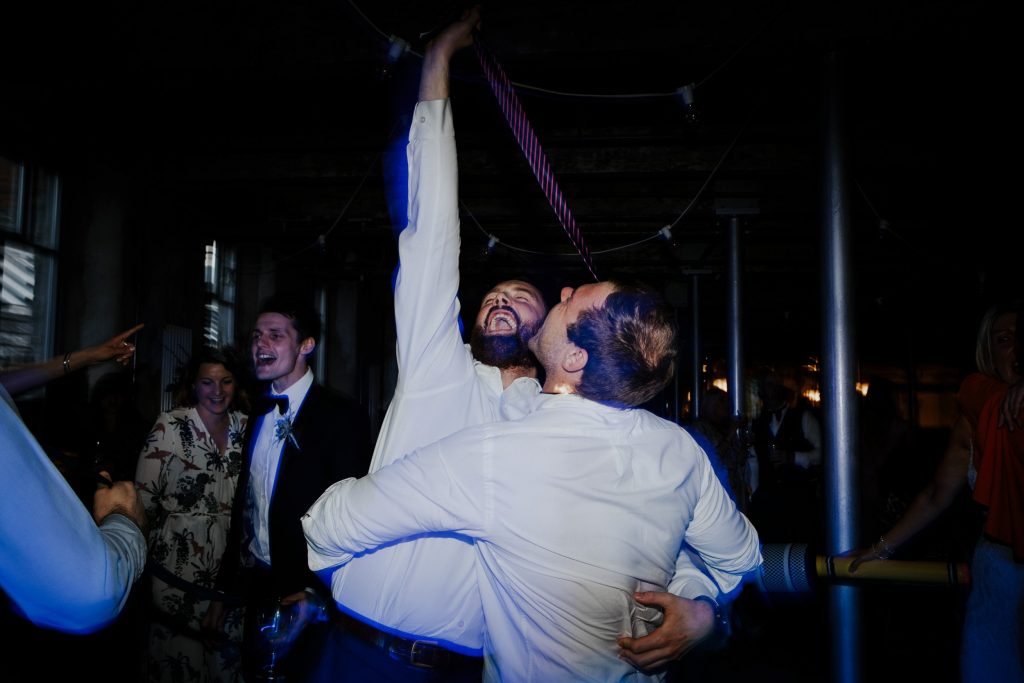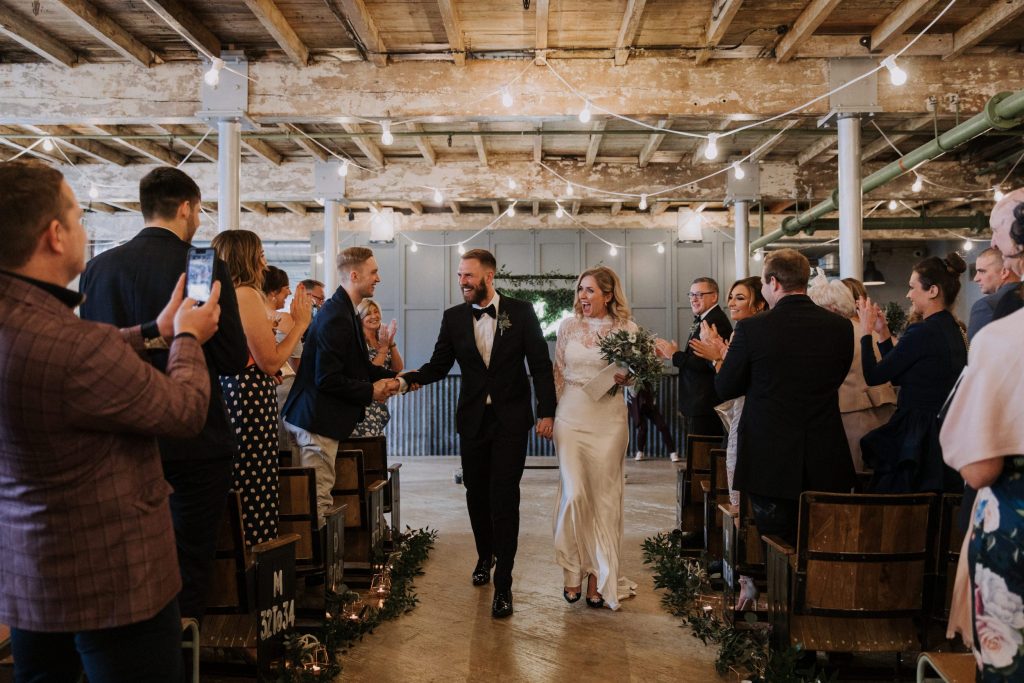 It was a overcast day with a bit of rain, which didn’t bother them at all. While the guests enjoyed canapés and cocktails in The Engine Room, we wandered around the venue doing fun and creative portraits. My favourite photo from the day was after all the guests had gone upstairs and we had the big engine room to ourselves, – so industrial and plants everywhere 😍 When the weather isn’t great outside – it’s always a fun challenge to figure out cool spots indoors for couple photos!