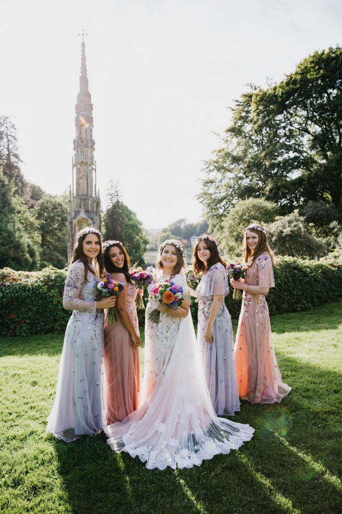 The whole bridal party carried gorgeous, vibrant bouquets, which included dahlias, daisies, roses and statice in shades of pink, orange, purple, all made by Jodie Farrell of Walled Garden Weddings.
